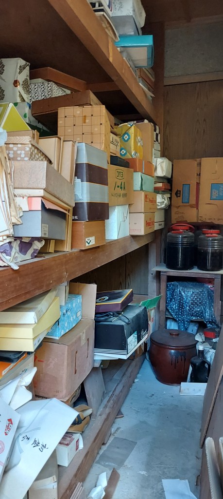 母屋の押し入れは、お布団でいっぱい。引き出物を2階にしまうのはやめたみたいですが、母屋から中庭を通って一番奥の離れに。